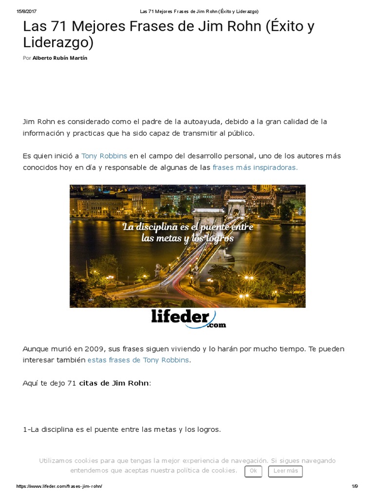 Debate Sabías que? página 127 - grupos.emagister.com from akifrases.com Citas y frases de jim rohn: Es la clase de persona en la que te tienes que convertir para llegar a serlo. La mejor recompensa de convertirte en millonario no es la cantidad de dinero que ganes. Jimrohn exito frases pensamientos positivos motivacion frases mensajes. No te pierdas las mejores frases de jim rohn. Frases de jim rohn, considerado como el padre de la autoayuda, debido a la gran calidad de la información y practicas que ha sido las mejores citas de jim rohn. Es un escritor de muchos libros sobre temas de liderazgo, motivacion, autoayuda y motivacion. Fue un empresario estadounidense, autor y orador motivacional.